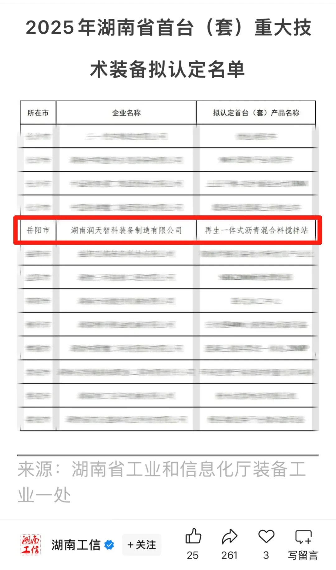 近日,湖南省工業(yè)和信息化廳公示了2025年度湖南省首臺(tái)(套)重大技術(shù)裝備擬認(rèn)定名單,潤天智科裝備股份有限公司自主研發(fā)的“LBR系列再生一體式瀝青混合料攪拌站”憑借其多項(xiàng)關(guān)鍵技術(shù)突破與重大創(chuàng)新成果,榮耀登榜。