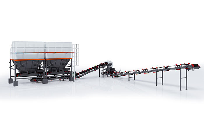 | 冷料系統(tǒng) 單倉(cāng)容積12m3,采用內(nèi)振式結(jié)構(gòu),振動(dòng)幅度大,保證卸料流暢。 給料皮帶機(jī)采用變頻+門開度控制給料,保證初級(jí)配的穩(wěn)定。 配有缺料報(bào)警裝置。 冷料倉(cāng)頂部配有格柵裝置,剔除大塊物料。 |
