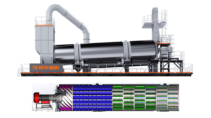 | 再生干燥滾筒 滾筒加熱方式采用火焰輻射熱和煙氣熱交換組合方式進(jìn)行加熱,充分利用熱量,降低燃油成本。 滾簡(jiǎn)采用專利防粘技術(shù),內(nèi)部葉片獨(dú)特布置,采用把式結(jié)構(gòu)+擺動(dòng)鏈條+錯(cuò)落布置+長(zhǎng)滾筒結(jié)構(gòu),保證再生滾簡(jiǎn)形成良好料簾,提高熱效率。擺動(dòng)鏈條防止再生料黏附。 減速電機(jī)直聯(lián)驅(qū)動(dòng),驅(qū)動(dòng)高效。 出料端設(shè)有紅外線測(cè)溫裝置。 |