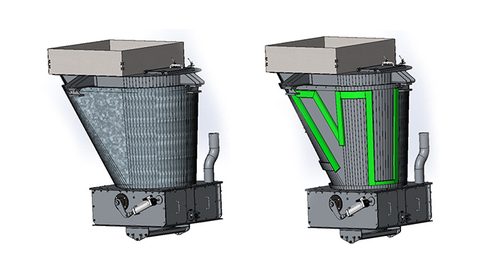 | 再生熱料倉(cāng) 熱料倉(cāng)采用大倉(cāng)容的結(jié)構(gòu),大角度倉(cāng)壁,倉(cāng)壁設(shè)有導(dǎo)熱油加熱裝置,保證再生料卸料流暢,不黏附。 熱料倉(cāng)采用大小門結(jié)構(gòu),具有粗精稱功能。 |